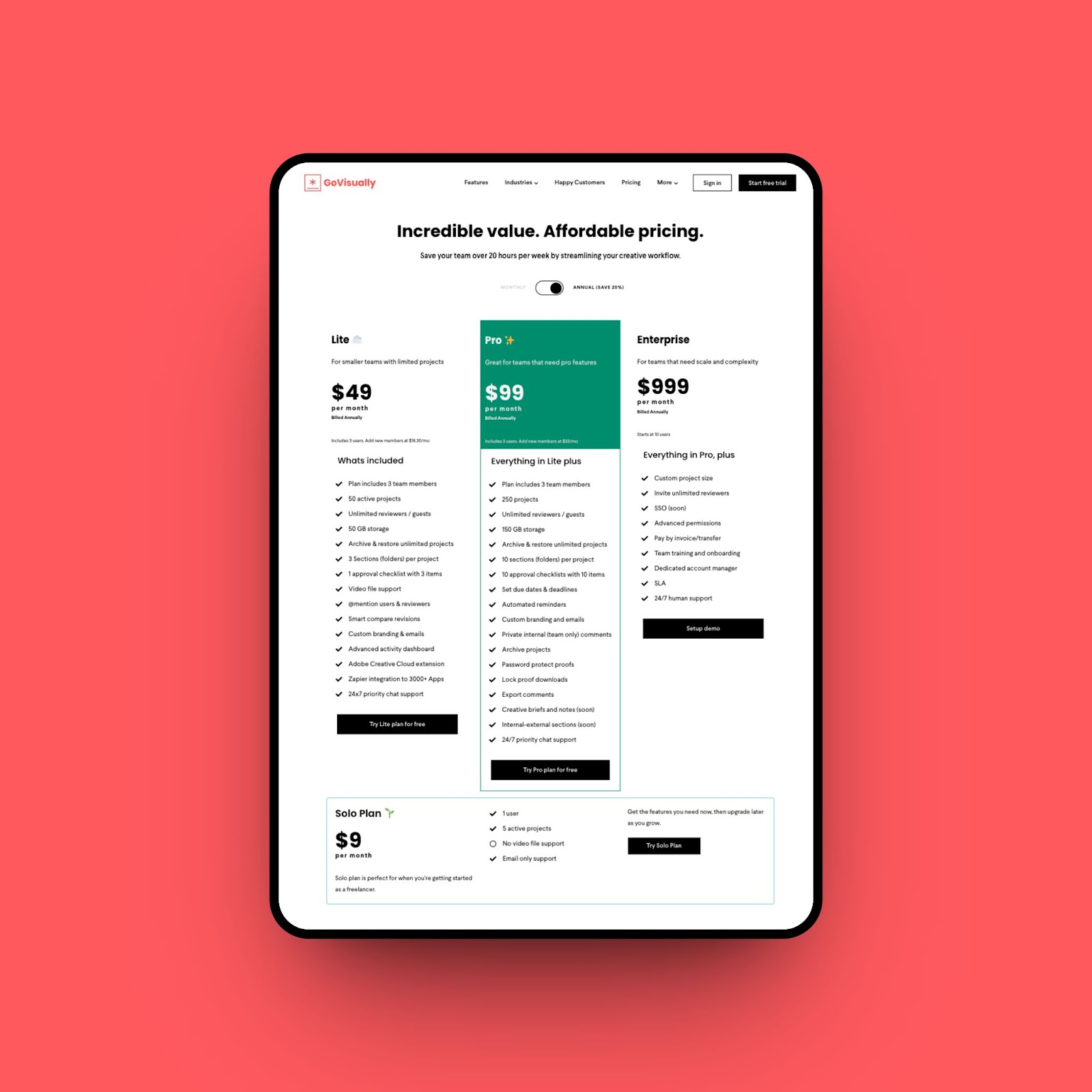 Starting with GoVisually’s pricing – the Solo plan begins at $9 per month, making it a cost-effective choice. This option is tailored for individual users and small teams with modest project needs, keeping things budget-friendly.